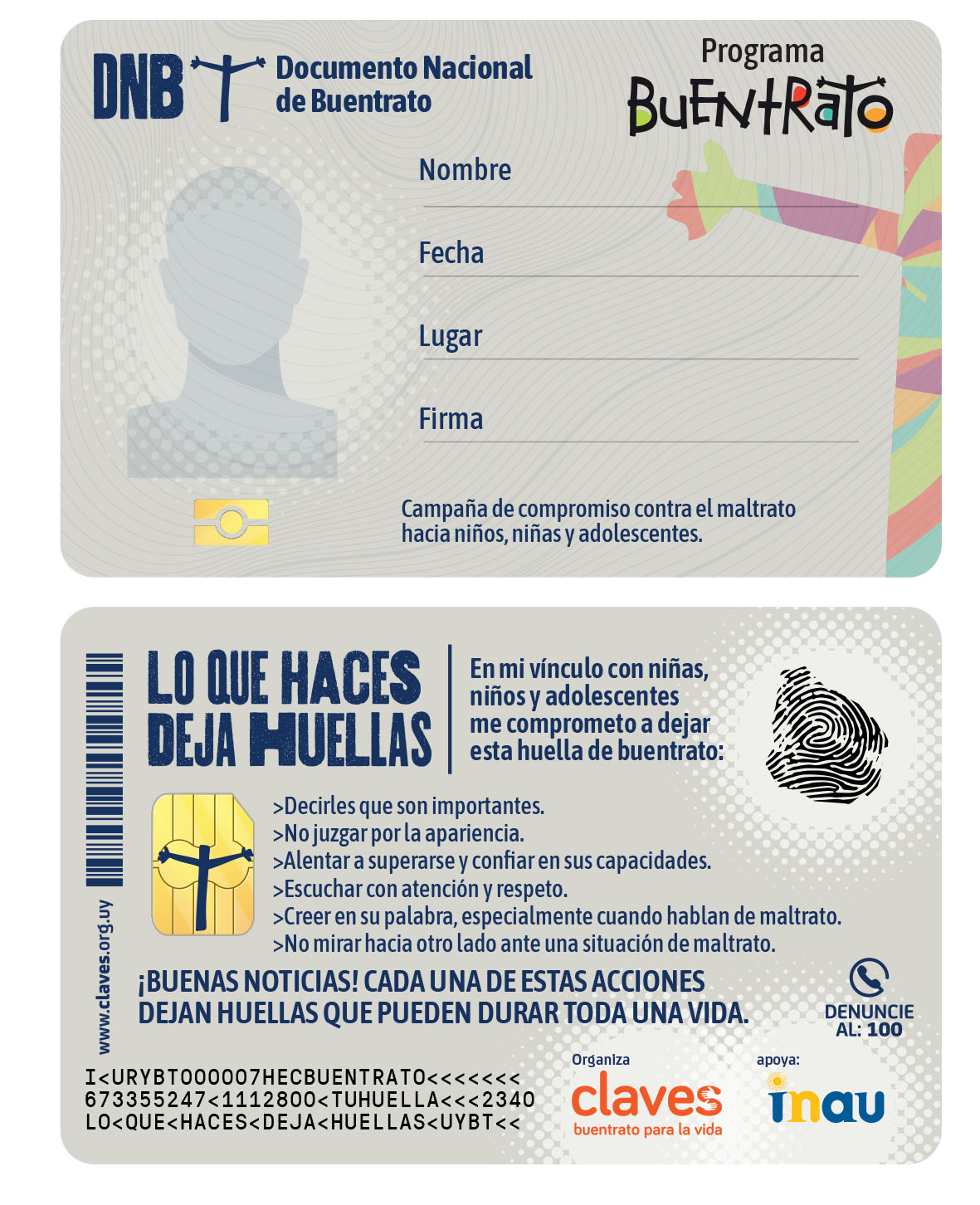 Las/os adolescentes capacitados se convierten en promotores/as de buentrato hacia la infancia y adolescencia, invitando a los/as adultos/as a convertirse en ciudadanos/as del buentrato a través de una cédula (ficticia) que simula su nueva ciudadanía. Al dorso, se encuentran descritos algunos de los compromisos que asumen adultos al aceptar el nuevo documento.